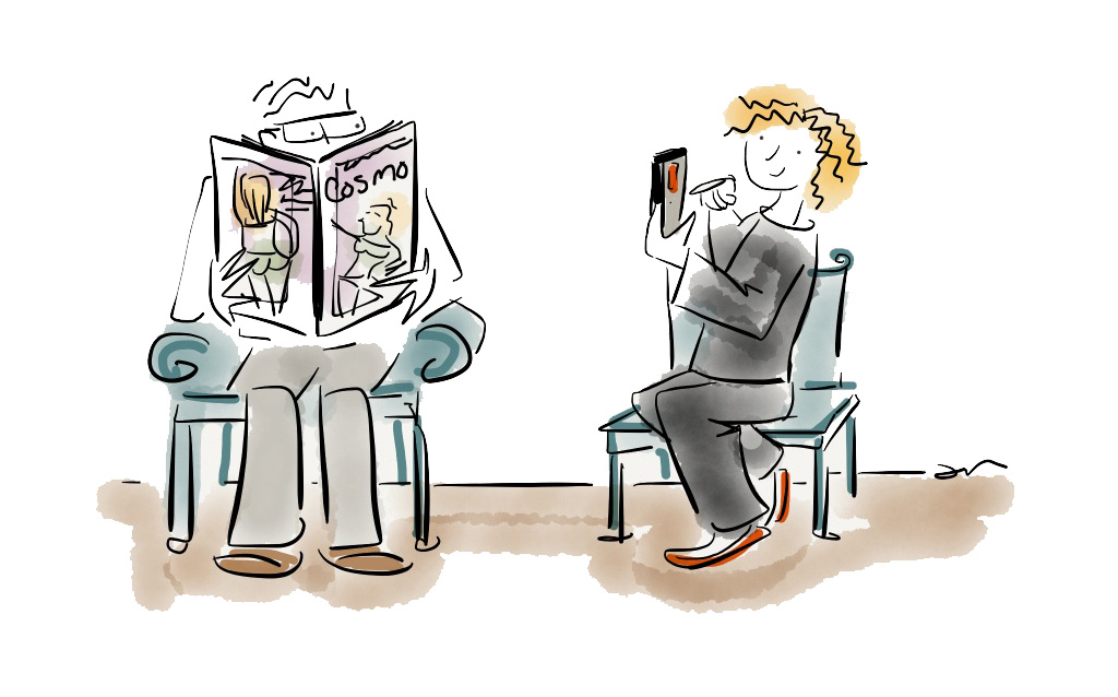 Once we got there He filled out forms and we looked through the magazines. I emailed a picture of him reading Cosmopolitan to Liz  and then they called him into the examination room. About 45 minutes later one of the people from the place asked if I was me and told me that David said that since he’d be another 45 minutes I could go home if I wanted to.