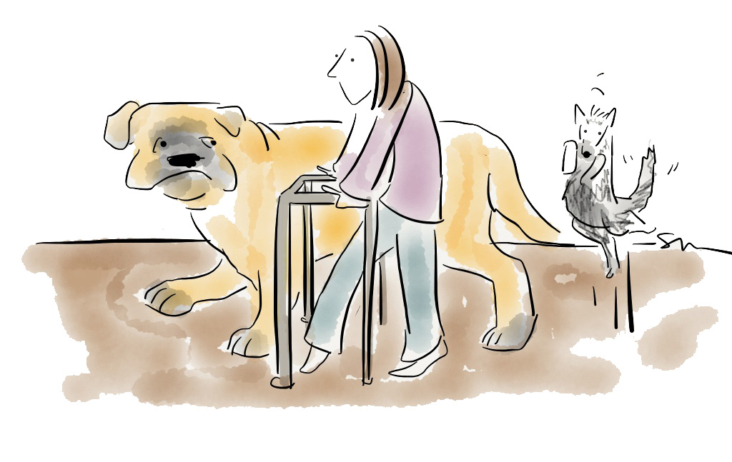 Until she is recovered, Marcia is temporarily using a walker. Interestingly enough she gets around the house quite well considering she has one dog the size of a cow and another who appears to be perpetually on speed. They know she isn’t herself though so they move near her very gently.