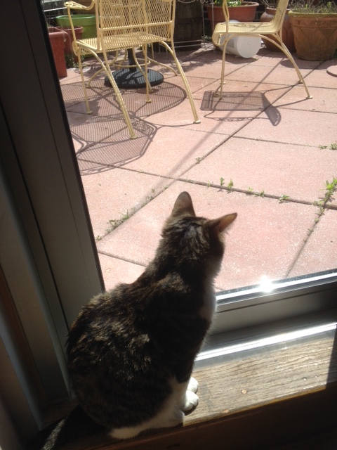 When people have outdoor cats they risk predators and cars and all kinds of things but they let the cats out anyway. Elvis spends a good part of his day looking out onto the terrace, either in front of the glass door or on the window sill.