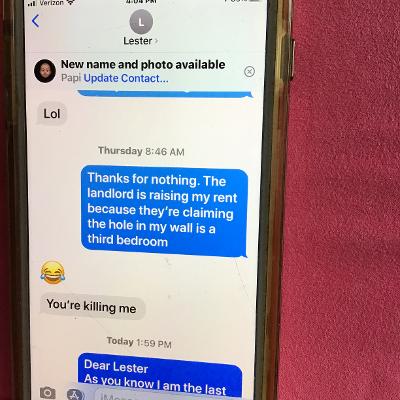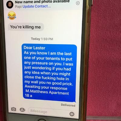 1. Mattie, at least Lester comes to your apt. I have a corner living room wall that is literally falling apart. So after 6months of asking him to look at it, he escorted me to my apt., peaked in, and said, “Yes, it was probably from heat in the wall last winter”. That was a month ago. When I see him, he shrugs his shoulders about fixing it! That probably means, “Fix it yourself lady”.