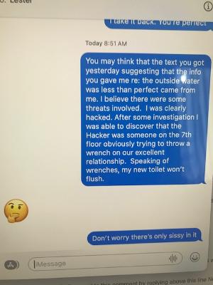 In fact after the toilet incident the very next day he had to come up because the outside water on my terrace wouldn’t turn off after I had my nephew follow his instructions to the letter.